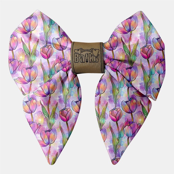 Na zadnej strane je našitá guma, vďaka ktorej sa mašľa ľahko upevní na obojok. Stred je z pravej kože, s vygravírovaným logom.