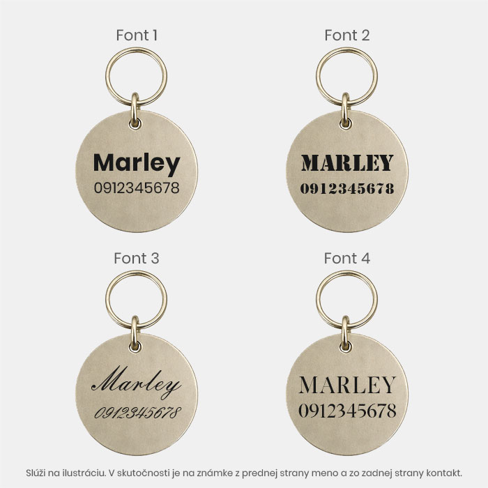 Vieme, že každý pes má inú osobnosť. Preto ti dávame na výber 4 štýlové fonty písma – od hravého až po elegantný kaligrafický štýl. Na prednú stranu vygravírujeme meno psa, ktoré bude hrdo reprezentovať jeho identitu.