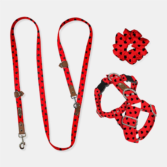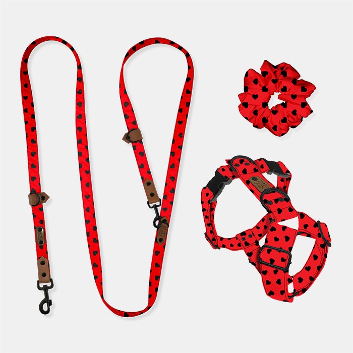 Štýlový set pre teba a tvojho psíka: nastaviteľný H-postroj, multifunkčná vôdzka Freehands v dĺže 300 cm (3 body zapnutia, až 5 spôsobov nosenia a 3 šírky 1,5 cm, 2 cm, 2,5 cm) a matchy scrunchie pre dokonalý outfit.