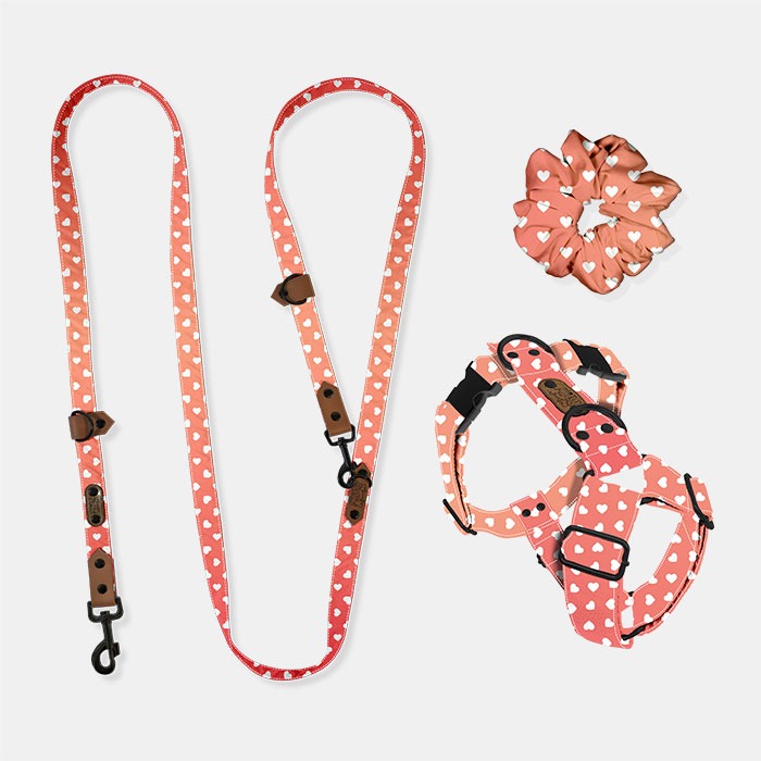 Štýlový set pre teba a tvojho psíka: nastaviteľný H-postroj, multifunkčná vôdzka Freehands v dĺže 300 cm (3 body zapnutia, až 5 spôsobov nosenia a 3 šírky 1,5 cm, 2 cm, 2,5 cm) a matchy scrunchie pre dokonalý outfit.