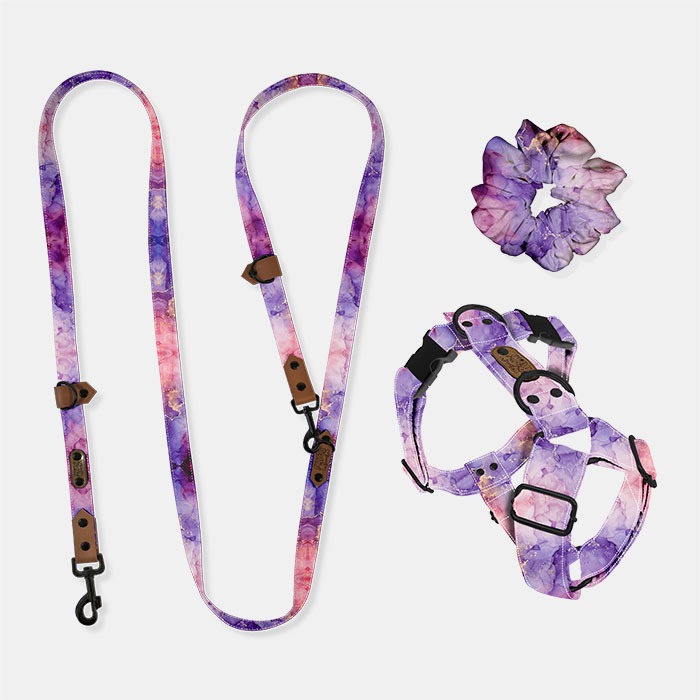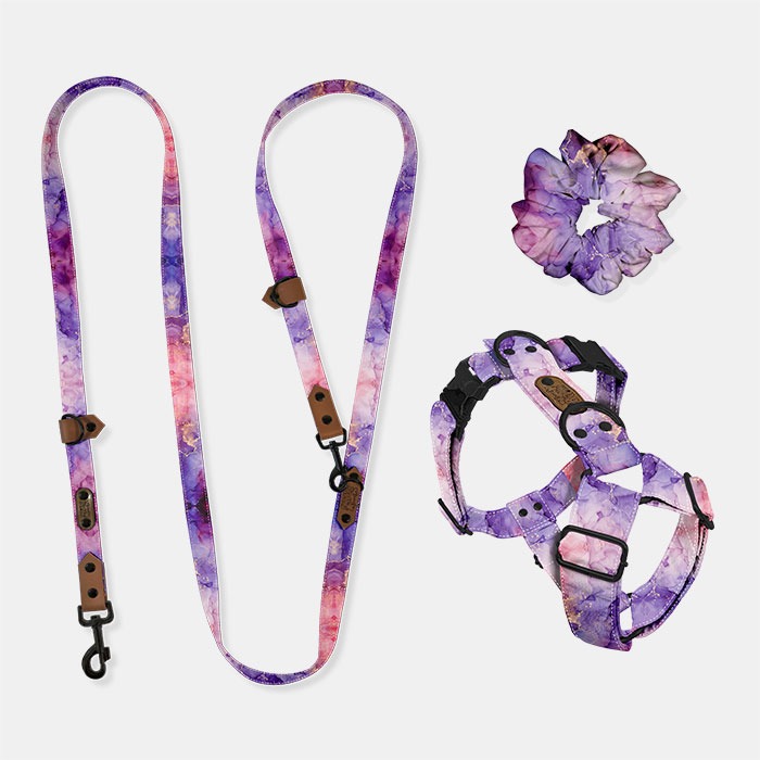 Štýlový set pre teba a tvojho psíka: nastaviteľný H-postroj, multifunkčná vôdzka Freehands v dĺže 300 cm (3 body zapnutia, až 5 spôsobov nosenia a 3 šírky 1,5 cm, 2 cm, 2,5 cm) a matchy scrunchie pre dokonalý outfit.